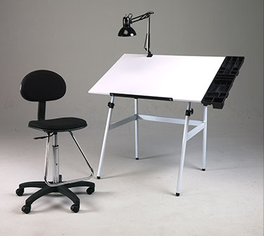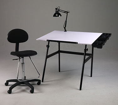 The Berkeley Classic 4-Pc Studio Combo begins with our famous Berkeley Classic Drawing Table, the original “fold-away” table with a 30” x 42” top. We pair this with a Lafayette Drafting Chair which features chrome footrest, multi-purpose castors and height adjustment range of 25”—34”. Table height adjusts from 32”—53" in the flat position. The Studio Combo also includes our Weber Museum clamp-on desk lamp and Black Side Tray for tools and reference material.