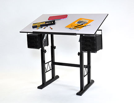 The Liz Drawing Table by Martin Universal Design features a generously sized white melamine top and a sturdy base with incremental height adjustment of 28 - 31.75". The top easily adjusts from 0 - 70 degrees with a one hand tilt mechanism and a convenient sheet stop/pencil ledge to keep work in place.