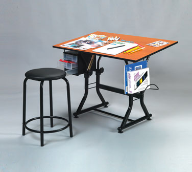The Ashley Creative Center is an ideal choice for artists, crafters and hobbyists when space is a consideration. The white melamine top measures 23.5” x 35.5”and rests on a sturdy tubular steel white powder-coated frame. The Ashley will easily adjust from 0 -45° with a simple one-hand tilt mechanism while height can incrementally be modified from 26” – 30.5” from the flat position. Tools can conveniently be stored in the three (3) drawer side unit while rolls and pads can rest in the foldable side rack. Padded stool is included.