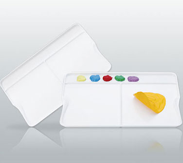 The Fredi Weber Peel-Able Tray Palette is constructed of sturdy, high-impact plastic and particularly well suited for oils and acrylics, though exceptionally compatible with all media. Its unique composition allows acrylic to peel off the surface and oils to be wiped off and cleaned easily with a damp cloth. It has three (3) unobstructed areas in an overall 12.75” L x 8.875” W surface with a slight lip to prevent paint from migrating over the edges. Designed to be comfortably held by both left and right handed artists. Unlike conventional butcher trays, which can bow, the Fredi Weber Peel-Able Tray Palette provides a flat and reliable surface as well as four (4) non-skid bumpers to keep palette from sliding.