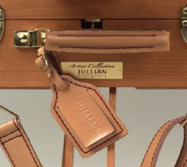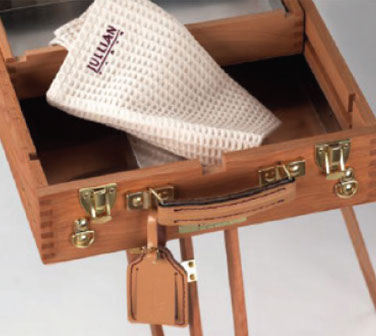 The Original Jullian® Full-Size French Sketchbox Easel is crafted of naturally dried Beechwood with a beautiful mahogany-toned finish and detailed in brass-plated hardware. This easel features the exclusive Jullian® locking system with locking top drawer, as well as adjustable telescoping legs with retractable spikes for stability in plein air use. This lightweight, versatile easel can be used as a table top easel or wet canvas carrier. A convenient backpack-style carrying case and genuine leather strap and tag holder are also included.