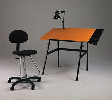 The Berkeley Classic 4-Pc Studio Combo begins with our famous Berkeley Classic Drawing Table, the original “fold-away” table with a 30” x 42” top. We pair this with a Lafayette Drafting Chair which features chrome footrest, multi-purpose castors and height adjustment range of 25”—34”. Table height adjusts from 32”—53" in the flat position. The Studio Combo also includes our Weber Museum clamp-on desk lamp and Black Side Tray for tools and reference material.