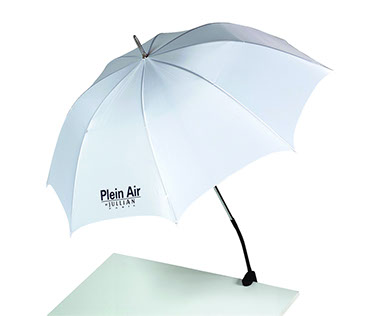 The authentic Jullian® Artist Umbrella is equipped with an adjustable gooseneck and clamp that easily attaches to easels or furniture. The translucent chiffon gently filters light from the work area without completely blocking the light source. This umbrella has a generous 46” diameter for maximum coverage, making it a “must-have” tool for all plein air painters.