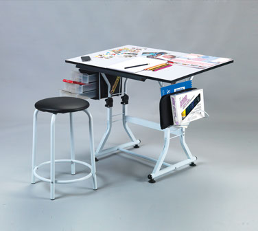 The Ashley Creative Center is an ideal choice for artists, crafters and hobbyists when space is a consideration. The white melamine top measures 23.5” x 35.5”and rests on a sturdy tubular steel white powder-coated frame. The Ashley will easily adjust from 0 -45° with a simple one-hand tilt mechanism while height can incrementally be modified from 26” – 30.5” from the flat position. Tools can conveniently be stored in the three (3) drawer side unit while rolls and pads can rest in the foldable side rack. Padded stool is included.