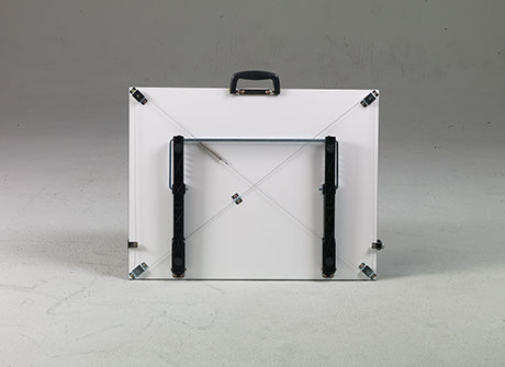 The Martin® Deluxe Adjustable Parallel Straight Edge Board stands alone as the premier item in its class and in the industry! This lightweight and portable board features a nonporous white melamine drawing surface and an anti-warp aluminum body straightedge that easily secures into position with two locking knobs. This deluxe model surface is backed with the exclusive and innovative Martin Adjusto-stand which provides five (5) angles of adjustment and rubber feet for added stability. Includes comfort handle for easy transport. White melamine top with aluminum straightedge.