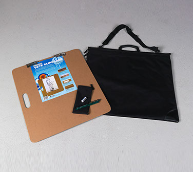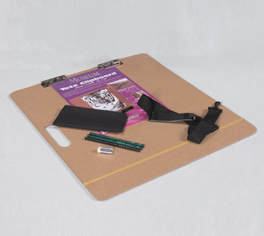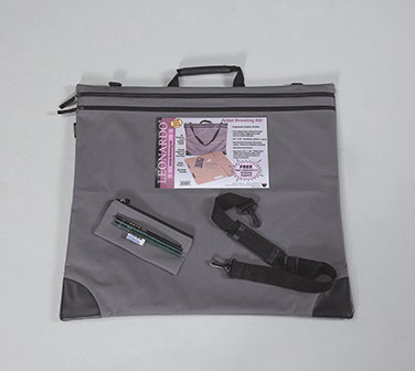The Martin® Leonardo Artist Drawing Kit pairs a sturdy, tempered Masonite clipboard with our popular soft-sided nylon portfolio to create this Back-to-School essential. The drawing clipboard measures 22”x25” and has two (2) unique “z-locking” clips as well as an over-sized rubber band to secure artwork. The 24”x27” portfolio, specially sized to accommodate the generously large drawing board, features reinforced corners, two exterior zippered compartments, a comfortable handle and removable shoulder strap. This kit also includes a handy removable tool bag with three (3) assorted drawing pencils and an artist eraser.