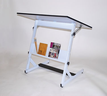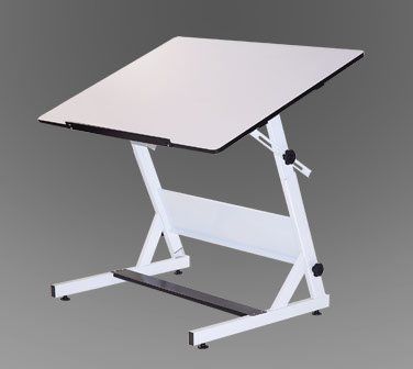 The Martin® MXZ Drawing/Drafting Table is constructed of heavy gauge steel and features a mechanism that adjusts both height and tilt. Equipped with a rigid and durable steel foot plate, it also includes adjustable rubberized feet and a rear facing book or accessory shelf. Finished in white premium baked enamel, the table height adjusts from 33" to 45.5".