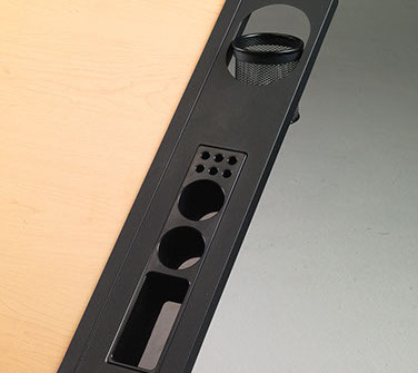 The Martin® Onyx Utility Side Tray is a great addition to any drawing table as it keeps tools easily accessible without forfeiting workspace. It affixes aside any 23.5” deep table edge with wood screws and measures just 23.5” x 6”. Three (3) recessed pans hold smaller items while six (6) wells keep drawing instruments upright. This tray also features a swinging cup holder for additional tools or water bottle and has a locking mechanism to keep stationary when needed.