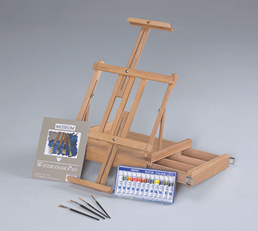 The Martin® Van Dyck Deluxe Studio Kit includes the incredible Avanti Van Dyck table top easel, constructed of beautifully finished and seasoned wood. This easel has adjustable upper and lower canvas supports, the lower allowing the artist to position their canvas below the table top surface. The easel is also equipped with a compartmentalized drawer and comes complete with acrylic, oil or watercolor painting material. Folds flat and locks in place for ease in transport and storage. Martin® Van Dyck Deluxe Painting Set arrives packaged in a full color gift box.