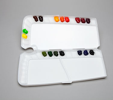 New from Mijello™, the Platinum Bulletproof 38 Palette for Watercolor features an innovative and substantial surface. Its design utlizes wells conveniently angled toward the user, and gently slanted to provide the ideal variation in depth for controlling pigments. The interior is crystal clear, allowing for consistant, accurate color representation between the palette and paper; and is constructed of the same durable, shockproof material used in the manufacturing of bulletproof glass. The lid and base each have 19 wells arranged in a semi-arc around large mixing areas. The non-porous interior cleans easily and its beautifully finished, pearly exterior is resilient enough to withstand years of studio use. When in use, this palette opens to a spacious 14-1/2" x 14-3/4" and features a thumbhole groove that enables comfortable support by either left- or right-handed artists. As a tabletop palette, it will rest flat with two (2) stabilizing rubber bumpers to prevent shifting while in use. Product Size: 14.5" x 14.75" open; 7.5" x 14.5" closed.